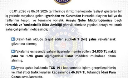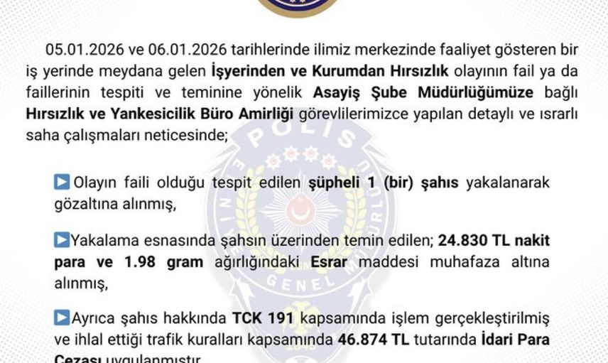 "05.01.2026 ve 06.01.2026 tarihlerinde il merkezinde meydana gelen işyerinden hırsızlık olayıyla ilgili tespit ve takip çalışmalarımız sürdürülmüştür. Asayiş Şube Müdürlüğü’ne bağlı Hırsızlık ve Yankesicilik Büro Amirliği ekiplerimiz, olayın failini tespit ederek yakalamıştır."