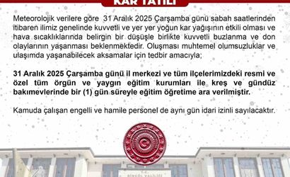 Bingöl Valiliği tarafından yapılan duyuruda, "Meteorolojik verilere göre 31 Aralık 2025 Çarşamba günü sabah saatlerinden itibaren ilimiz genelinde kuvvetli ve yer yer yoğun kar yağışının etkili olması beklenmektedir. Ayrıca hava sıcaklıklarında belirgin bir düşüşle birlikte kuvvetli buzlanma ve don olaylarının yaşanması mümkün. Bu olumsuzlukların ve ulaşımda yaşanabilecek aksaklıkların önüne geçmek amacıyla; 31 Aralık 2025 Çarşamba günü il merkezi ve tüm ilçelerdeki resmi ve özel tüm eğitim kurumları ile kreşler ve gündüz bakımevlerinde 1 gün süreyle eğitim öğretime ara verilmiştir." ifadesi yer aldı.