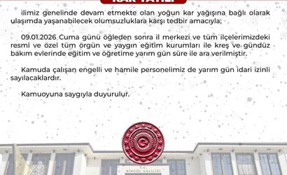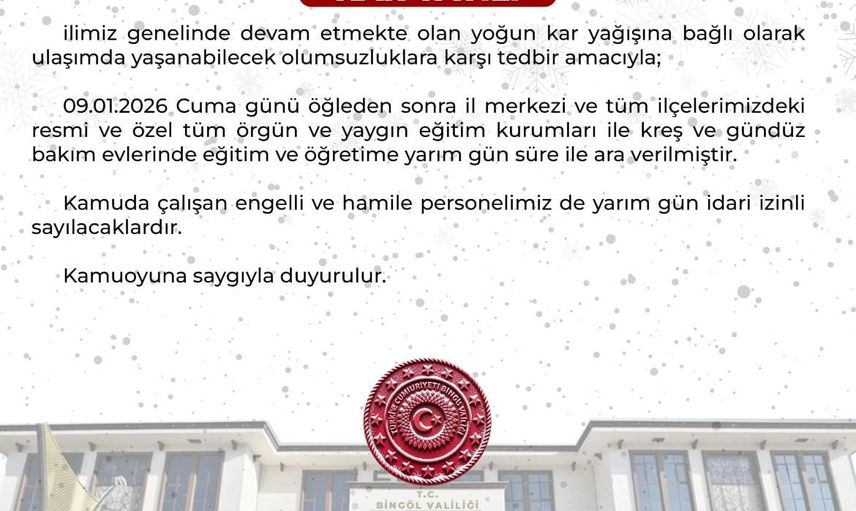 Bingöl Valiliği, bu durumu duyurarak, "İlimiz genelinde devam eden yoğun kar yağışına bağlı olarak ulaşımda yaşanabilecek olumsuzluklara karşı tedbir amacıyla; 09.01.2026 Cuma günü öğleden sonra il merkezi ve tüm ilçelerdeki resmi ile özel eğitim kurumları, kreş ve gündüz bakım evlerinde eğitime yarım gün ara verilmiştir" ifadelerini kullandı.