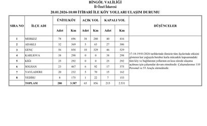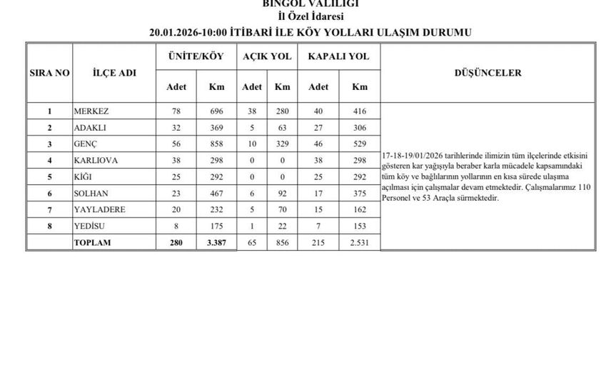 Bingöl İl Özel İdaresi koordinesinde yürütülen karla mücadele çalışmaları kapsamında, il genelindeki köy yollarının en kısa sürede ulaşıma açılması için 110 personel ve 53 araç sahada görev yapıyor. Ekiplerin yoğun çabalarıyla gün içerisinde birçok köy yolu ulaşıma açıldı. Ancak, mevcut durumda 65 köy yolu açıkken, 215 köy yolu kapalı kalmaya devam ediyor.