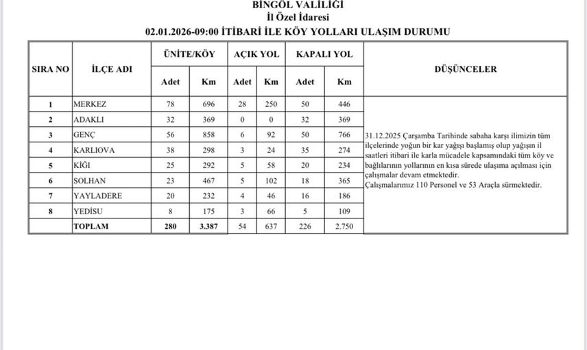 Bingöl İl Özel İdaresi, köy ve bağlı yerleşim yollarının tekrar ulaşıma açılması için karla mücadele ekiplerini seferber etti. 110 personel ve 53 araç ile gerçekleştirilen çalışmalar, aralıksız bir şekilde devam etmekte.