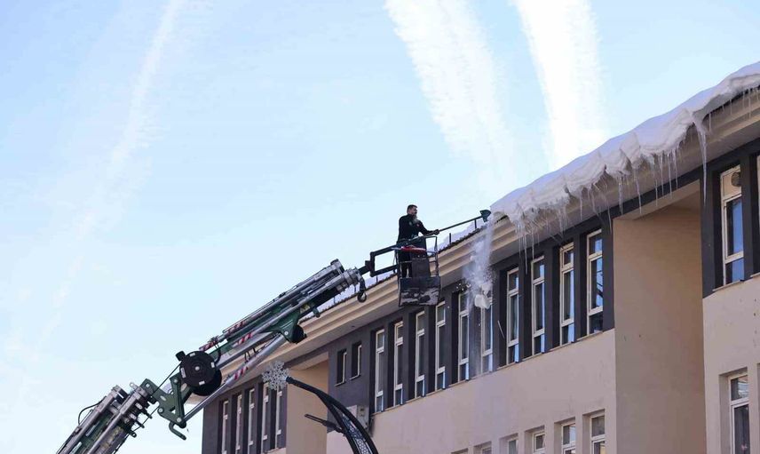 Bu kapsamda, İtfaiye Müdürlüğü ekipleri, başta okullar ve kamu kurumları olmak üzere, kentteki binalarda risk oluşturan buz sarkıtlarını tek tek temizleyerek güvenlik önlemlerini aldı.