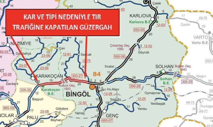 Bingöl Valiliği’nden yapılan açıklamada, "Bingöl-Elazığ Devlet Yolunun 0-51 km’leri arası (Bingöl Sancak kavşağı ile Karakoçan ayrım kavşağı arası) yoğun kar yağışı ve tipi nedeniyle saat 19.50 itibarıyla TIR trafiğine kapatılmıştır" denildi. Yoğun Kar Yağışı