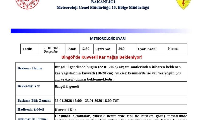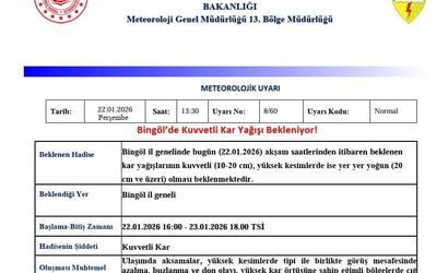 Meteoroloji 13. Bölge Müdürlüğü, Bingöl iline yönelik kuvvetli kar yağışı uyarısı yaptı. Yapılan açıklamada, "Bingöl il genelinde bugün (22.01.2026) akşam saatlerinden itibaren beklenen kar yağışlarının kuvvetli (10-20 cm), yüksek kesimlerde ise yer yer yoğun (20 cm ve üzeri) olması ve yağışın 23.01.2026 saat 18.00’a kadar sürmesi beklenmektedir. Ulaşımda aksamalar, yüksek kesimlerde tipi ile görüş mesafesinde azalma, buzlanma ve don olayları ile birlikte, yüksek kar örtüsüne sahip eğimli bölgelerde çığ tehlikesi gibi olumsuzluklara karşı dikkatli ve tedbirli olunmalıdır" denildi.
