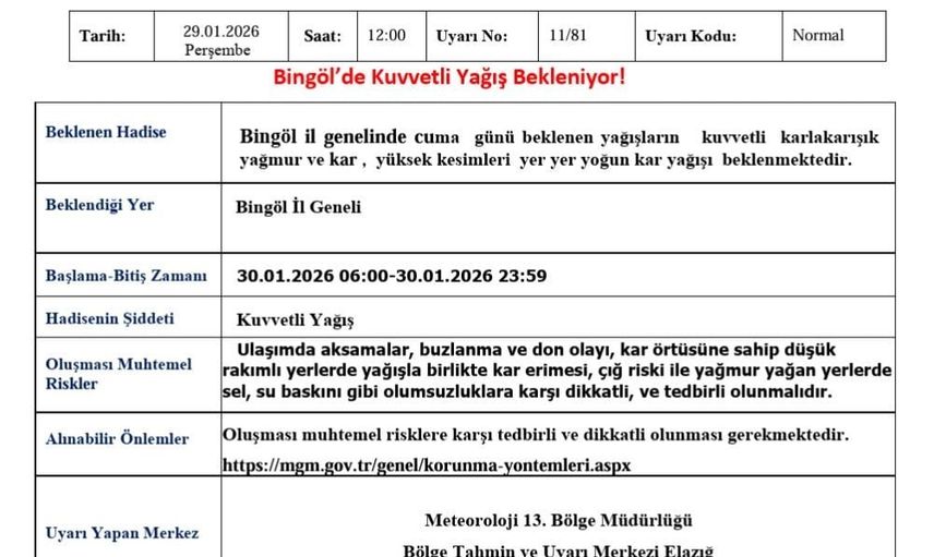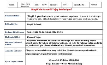 Yapılan açıklamada, "Bingöl il genelinde Cuma günü beklenen yağışların kuvvetli karla karışık yağmur ve kar şeklinde olacağı, yüksek kesimlerde ise yer yer yoğun kar yağışı görülecektir" ifadesi yer aldı.