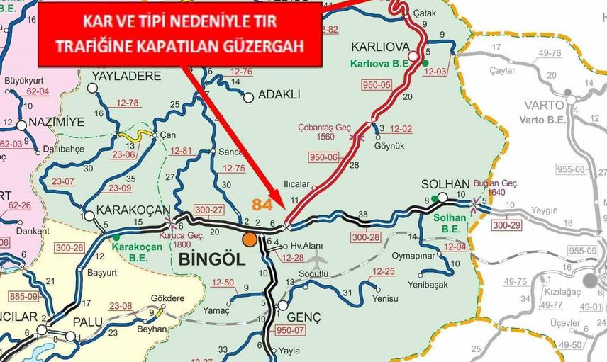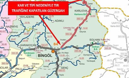 Bingöl Valiliği'nden yapılan duyuruda, "Bingöl-Erzurum Devlet Yolunun 0-88 km’leri arası (Kervansaray kavşağından Bingöl-Erzurum il sınırına kadar) ve Bingöl-Diyarbakır devlet yolunun 0-31 km’leri arası (Genç ilçe girişinden Diyarbakır il sınırına kadar) yoğun kar yağışı ve tipi nedeniyle saat 20.30 itibarıyla TIR trafiğine kapatılmıştır" ifadelerine yer verildi.