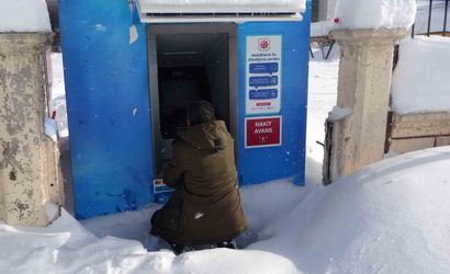 Yoğun kar nedeniyle para çekme noktalarında ilginç görüntüler ortaya çıkıyor. ATM'lerin çevresini saran kar yığınları arasında işlem yapmak isteyenler, ayakta duracak yer bulamadıkları için karın üzerine oturarak para çekmek durumunda kalıyorlar.