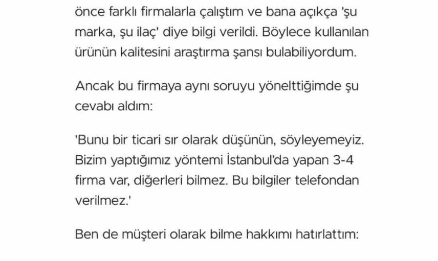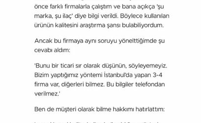 Kullanıcı, "Kullanılan ilacın markasını öğrenmek istediğimde, firma bunu ticari bir sır olarak nitelendirip ifşa edemeyeceklerini söyledi. Bu durum, firmanın güvenilirliği hakkında düşündürücü bir izlenim bıraktı," şeklinde ifade etti.