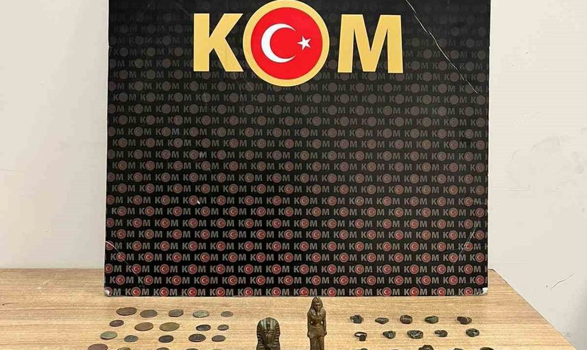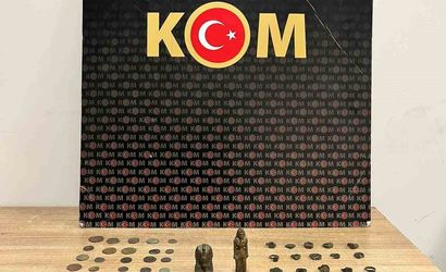 Baskın sırasında, 2 şüphelinin evlerinde ve araçlarında yapılan aramalarda 55 adet sikke, 34 adet yüzük ve 2 adet tarihi obje bulundu.