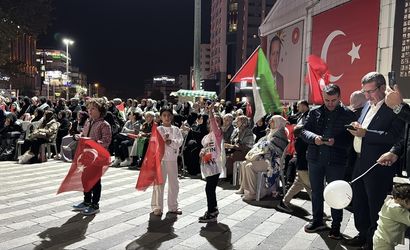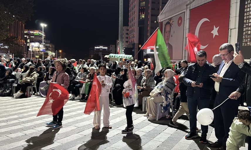 Bursa'nın Osmangazi ilçesinde, 15 Temmuz Demokrasi Meydanı'nda bir araya gelen çok sayıda vatandaş, İsrail'in Küresel Sumud Filosu'na yönelik saldırılarını protesto etti.
