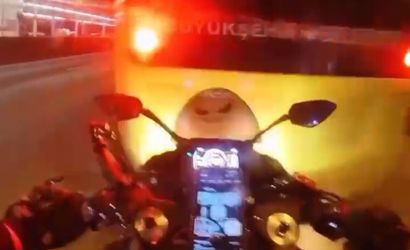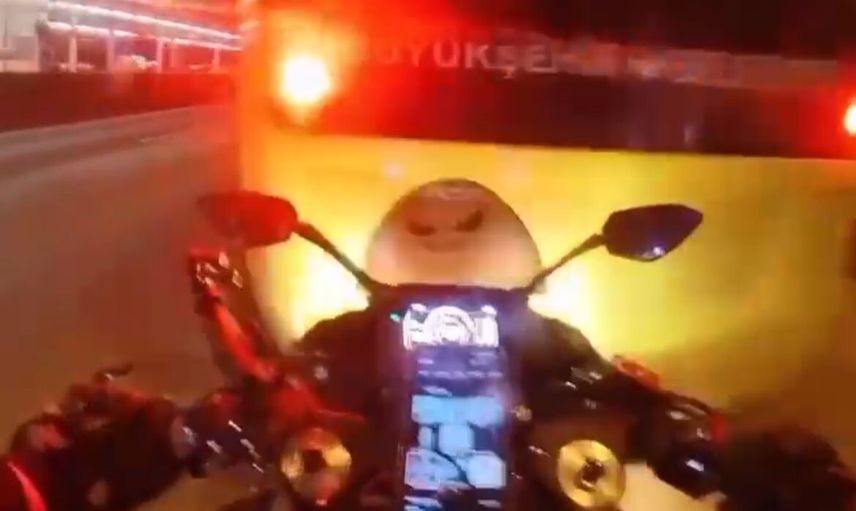 Bursa’nın Yıldırım ilçesinde ilginç bir kaza gerçekleşti. Bir motosiklet, trafikte bekleyen bir belediye otobüsüne çarptı. Kazanın görüntüleri, motosiklet sürücüsünün kask kamerası tarafından kaydedildi.