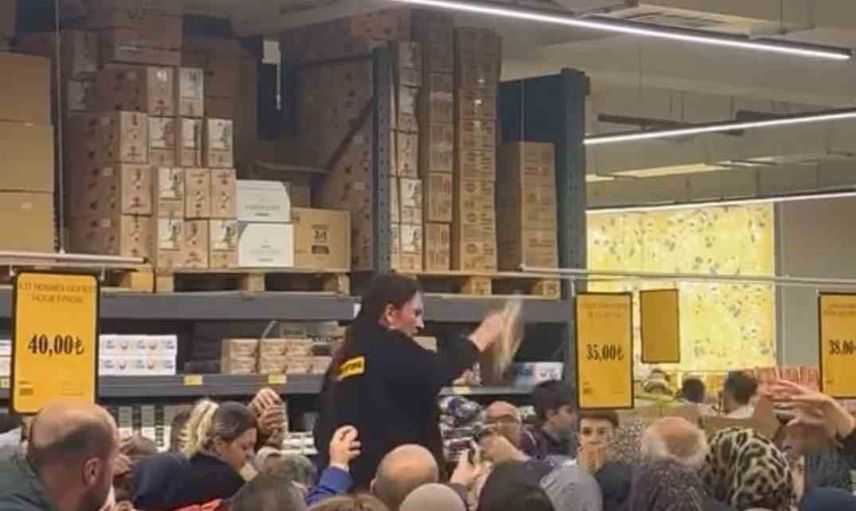 Birçok vatandaş, indirimli ürünleri almak için markete akın etti. Bu esnada, çalışanların ürünleri kalabalığa fırlattığı anlar dikkat çekti.