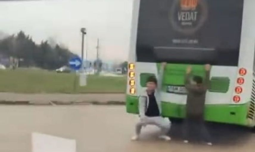 Bursa'nın Yıldırım ilçesi Millet Mahallesi'nde meydana gelen olayda, 10-15 yaşlarındaki iki çocuk, şehir içi otobüsün arkasına tutunarak son derece tehlikeli bir yolculuk yaptı.