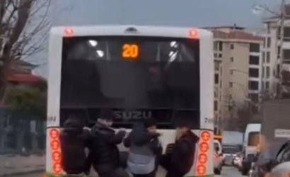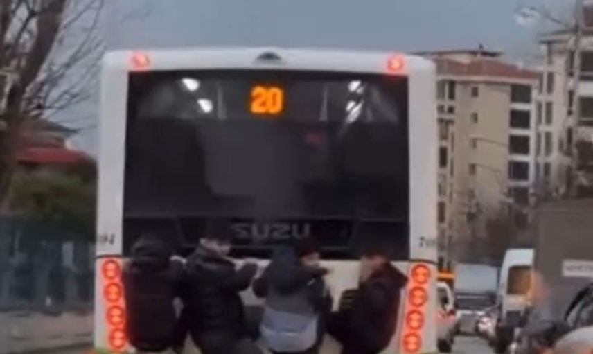 Bursa’nın Yıldırım ilçesi Millet Mahallesi Cengizhan Caddesi üzerinde bir belediye otobüsü, seyrine devam ederken, arkasında 4 çocuk dikkat çekici bir şekilde otobüse tutunarak yol aldı. Bu tehlikeli davranış çevrede paniğe neden oldu.