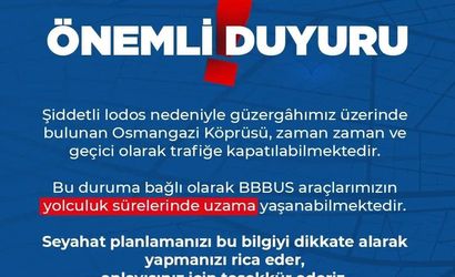 Burulaş, sosyal medya hesaplarından yaptığı açıklamada, "Şiddetli lodos sebebiyle güzergahımızda bulunan Osmangazi Köprüsü, zaman zaman ve geçici olarak trafiğe kapatılabilmektedir. Bu yüzden BBUS araçlarının yolculuk sürelerinde uzamalar olabilmektedir. Seyahat planlarınızı bu duruma göre düzenlemenizi rica eder, anlayışınız için teşekkür ederiz." ifadesine yer verdi.