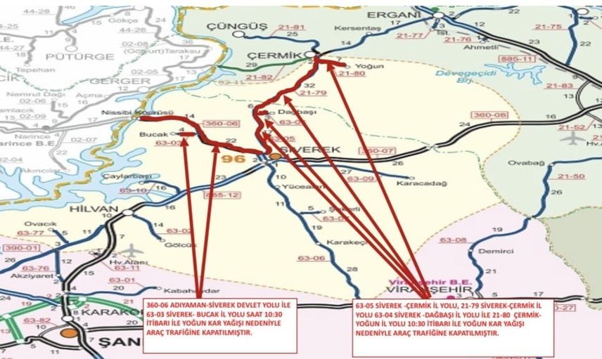 Diyarbakır'ın Çermik ilçesi ile Şanlıurfa'nın Siverek ilçesi arasında bulunan karayolu, yoğun kar yağışı nedeniyle ulaşıma kapandı.