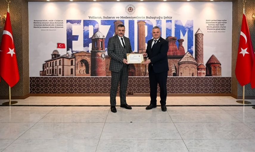 Erzurum Valisi Mustafa Çiftçi, Devlet Su İşleri (DSİ) 8. Bölge Müdürü Oğuzhan Yavuz ve Karayolları 12. Bölge Müdürü Fatih Günaydın, çevre yatırımlarına sundukları destek nedeniyle başarı belgeleriyle ödüllendirildi.