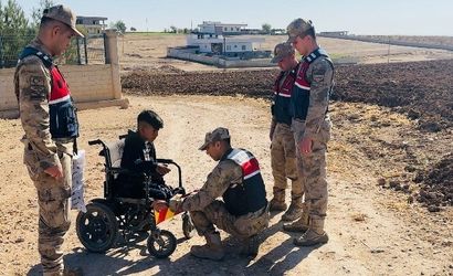 Şanlıurfa’nın Ceylanpınar ilçesinde, devriye görevini sürdüren jandarma ekipleri, bedensel engelli genç Enes Akkuş'un akülü tekerlekli sandalyesine reflektör takma talebini dikkate aldı.