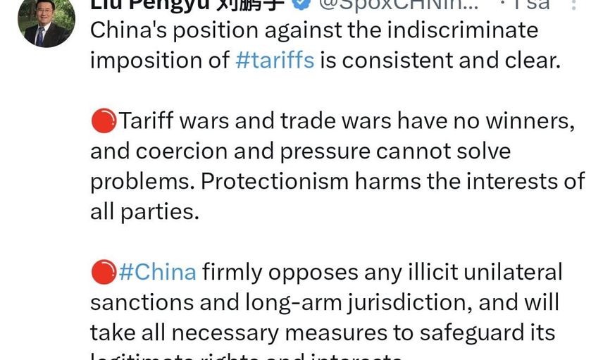 Çin’in ABD Büyükelçiliği Sözcüsü Liu Pengyu, sosyal medya platformu X üzerinden ülkesinin gümrük vergilerine ilişkin tutumunu net bir şekilde belirtti. Liu, "Gümrük vergisi savaşlarının ve ticaret savaşlarının kazananı yoktur, zorlama ve baskı sorunları çözemez. Korumacılık tüm tarafların çıkarlarına zarar verir" dedi.