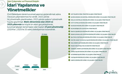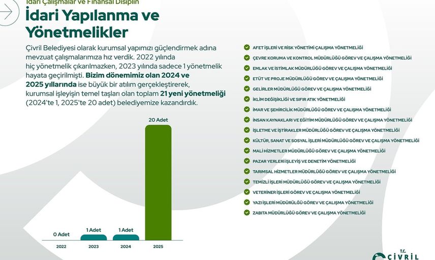 Belediyenin kurumsal yapısını güçlendirmek için önemli adımlar attıklarını vurgulayan Başkan Dere, meclis kararı ile 2024 yılında 1, 2025 yılında ise 20 olmak üzere toplam 21 yönetmeliğin hayata geçirileceğini açıkladı.