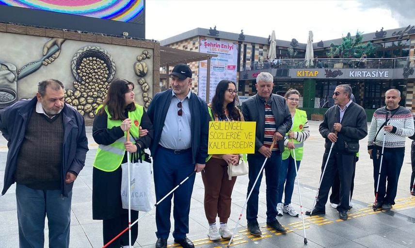 "Asıl engel, sözlerde ve kalplerdedir", "Asıl engelliler, onları görmeyenlerdir", "Kılavuz çizgimi terk et, beyaz bastonu fark et" yazılı dövizleri taşıyan katılımcılar, yürüyüş boyunca düdük çalarak farkındalığı artırmaya çalıştılar.