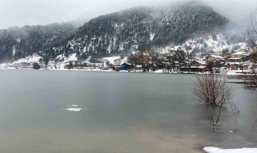 Devam eden soğuk hava koşulları, bölgedeki göl yüzeyinin donmasına sebep oldu. Beyaz örtüyle kaplanan doğanın birlikte oluşturduğu eşsiz manzaralar, bu kış aylarında göz kamaştırıyor.