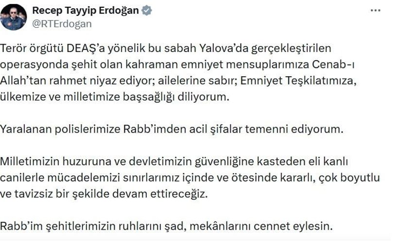 Erdoğan, mesajında, "Terör örgütü DEAŞ’a yönelik bu sabah Yalova’da gerçekleştirilen operasyonda şehit olan kahraman emniyet mensuplarımıza Cenab-ı Allah’tan rahmet niyaz ediyor; ailelerine sabır; Emniyet Teşkilatımıza, ülkemize ve milletimize başsağlığı diliyorum. Yaralanan polislerimize Rabb’imden acil şifalar temenni ediyorum" ifadelerini kullandı.