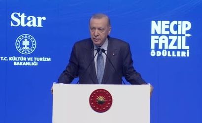 İstanbul’da düzenlenen 12. Necip Fazıl Kısakürek Ödülleri programında katılımcılara seslenen Erdoğan, "Bu yıl 'Sonsuzun Fethine Çık' temasıyla gerçekleştirdiğimiz ödül töreninin, ülkemiz ve milletimiz için hayırlara vesile olmasını diliyorum" dedi. Programa; bakanlar ve birçok sanatçı katıldı.