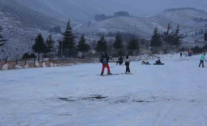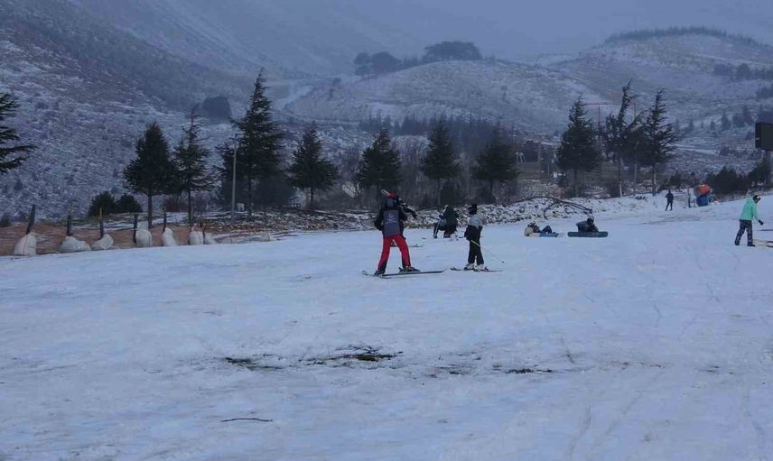 Davraz Kayak Merkezi’nde etkili olan kar yağışı, özellikle zirve bölgelerinde kendini gösterirken, alt kısımlarda yeterli yağış olmaması nedeniyle ziyaretçiler suni karlama alanlarında kayak aktivitelerine devam ediyor.