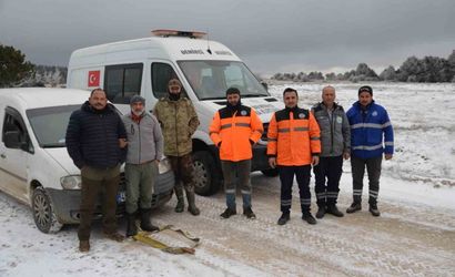 Yardım çağrısının alınmasının ardından, 5 kişilik Demirci Belediyesi Arama Kurtarma Timi, zorlu arazi koşullarına rağmen bölgeye hızla ulaştı. Mahsur kalan avcıların aracı, halat yardımıyla kurtarılarak güvenli bir bölgeye taşındı.