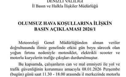 DENİZLİ VALİLİĞİ TARAFINDAN YAPILAN AÇIKLAMADA, "YOĞUN FIRTINA NEDENİYLE MOTOSİKLET, ELEKTRİKLİ SCOOTER VE MOTORLU KURYELERİN TRAFİĞE ÇIKIŞLARI DURDURULMUŞTUR" İFADELERİ YER ALDI.