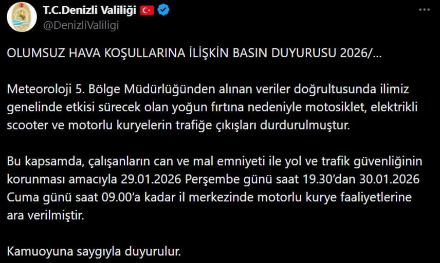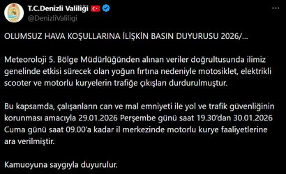 Meteoroloji verilerine dayanan bilgilere göre, Denizli'de etkili olmaya devam eden yoğun fırtına sebebiyle, Denizli Valiliği, motorlu kurye faaliyetlerini geçici olarak durdurma kararı almıştır.