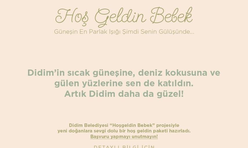 'Hoş Geldin Bebek' projesine başvuruda bulunmak isteyen aileler, Didim Belediyesi Halk Masası ile iletişime geçerek kayıt yaptırabiliyorlar.