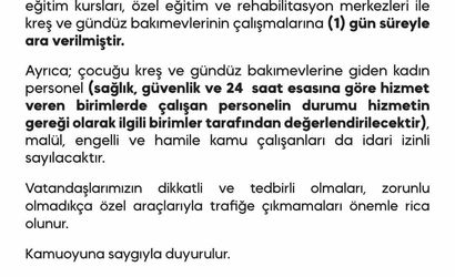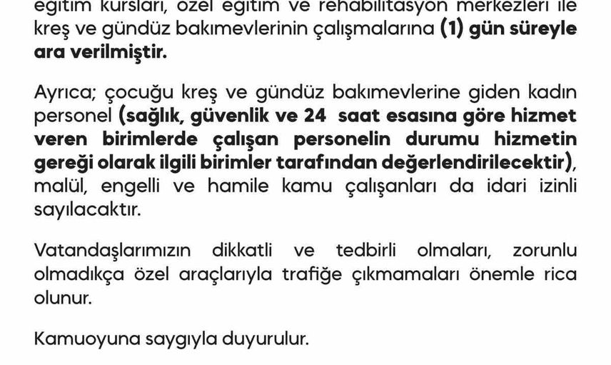 Ayrıca, çocuğu kreş ve gündüz bakımevlerine giden kadın personel, malül, engelli ve hamile kamu çalışanları için de idari izin uygulanacağı belirtildi. Valilik, vatandaşların dikkatli olmalarını ve mümkünse özel araçlarla trafiğe çıkmamalarını rica etti.