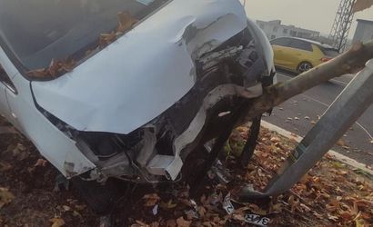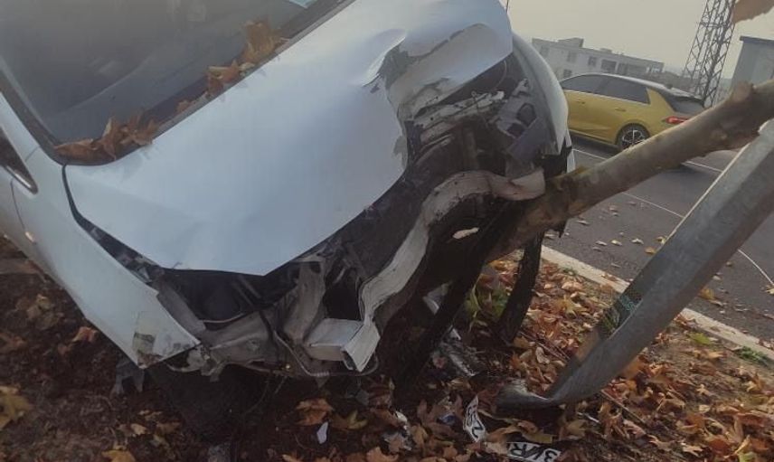 Bu manevra sonucu kontrolden çıkan araç, refüje çıkarak bir ağaç ve aydınlatma direğine çarptı. O anlar, bölgedeki güvenlik kameraları tarafından kaydedildi. Maddi Hasar Oluştu