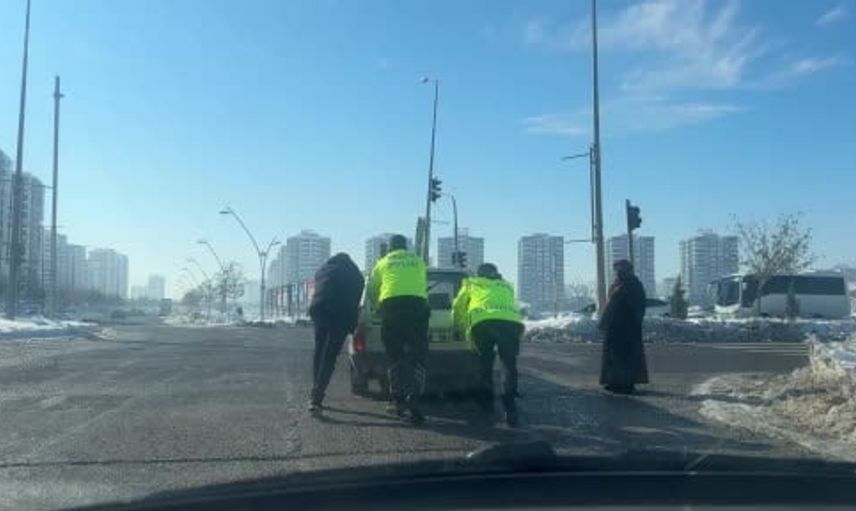 Kendisi uzun süre otomobilini çalıştırmaya çalışan sürücünün imdadına, bölgedeki trafik polisleri yetişti. Otomobilin çalışmaması üzerine polis memurları, sürücüye yardım etmek için hemen harekete geçti.