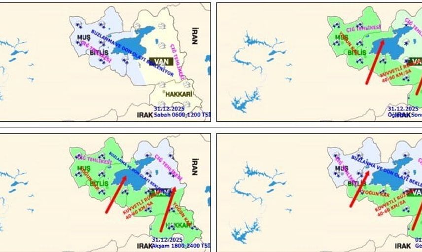 Son değerlendirmelere göre, bölge genelinde hava çok bulutlu olacak. Sabah saatlerinden itibaren Muş ve Bitlis çevrelerinde, öğle saatlerinden sonra ise Van ve Hakkari çevrelerinde aralıklı kar yağışları bekleniyor. Yağışların etkisi, öğle saatlerinden sonra yer yer kuvvetli ve yoğun şekilde artacaktır.