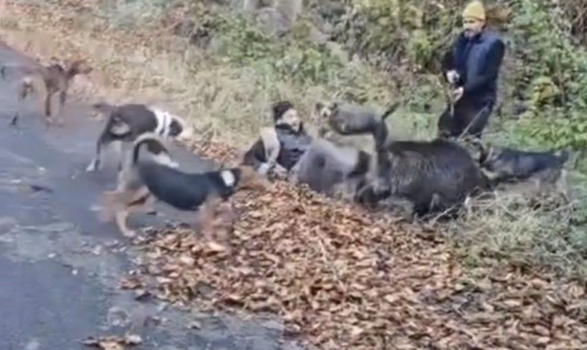 Trabzon'da ava çıkan bir grup avcı, karşılarına çıkan yaban domuzunun saldırısına maruz kaldı. O anlar cep telefonuyla kaydedilirken, yaşça büyük avcı Hasan Hacıhamzaoğlu'nun durumu dikkat çekti.