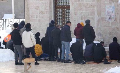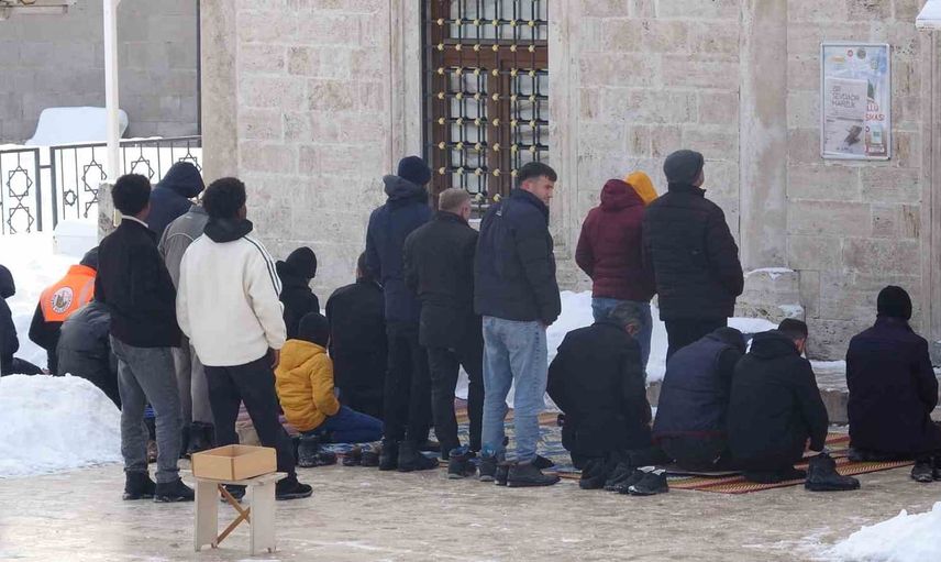 Sivas'ta Cuma namazına katılan cemaat, sıfırın altında 10 dereceye varan dondurucu soğuğa rağmen açık alanda bir araya geldi.