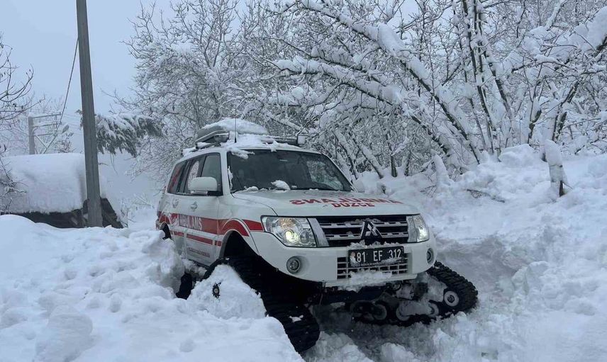 Düzce’nin yüksek kesimlerinde etkisini gösteren kar yağışı, Yığılca’ya bağlı Tuğrul köyünde yolları kapattı. Bu zorlu hava koşullarında, 95 yaşındaki bir hastanın acil yardımına paletli ambulans yetişti.