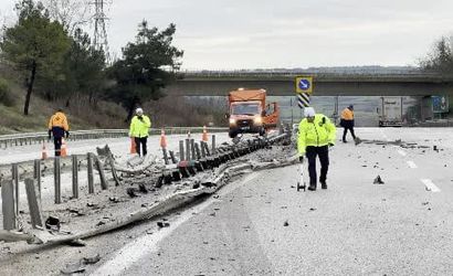 Edirne otoyolunda ilerleyen bir tır, sürücüsünün kontrolünü kaybetmesi sonucunda bir kaza geçirdi. Kazanın meydana geldiği Kapıkule yolunda, tır bariyerleri adeta kağıt gibi ezerek ilerledi.