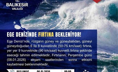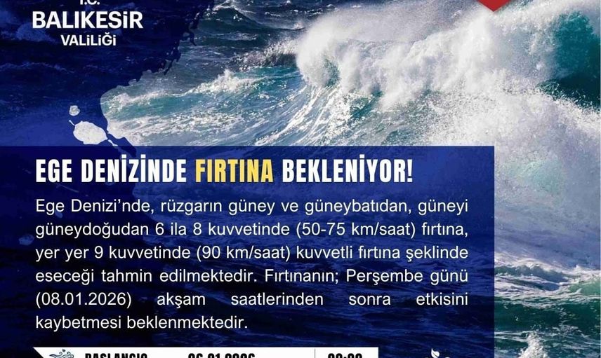 BALIKESİR VALİLİĞİ, EGE DENİZİ'NDE BEKLENEN FIRTINA VE KUVVETLİ FIRTINAYA KARŞI UYARIDA BULUNDU.