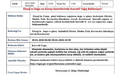 Yapılan açıklamada, "Elazığ’da Cuma günü doğu ve güney ilçelerinde, özellikle Sivrice, Maden, Palu, Kovancılar, Alacakaya, Arıcak ve Karakoçan bölgelerinde kuvvetli yağmur ve karlakarışık yağmur beklenmektedir. Ayrıca, yüksek kesimlerde yer yer yoğun kar yağışı tahmin ediliyor" ifadeleri kullanıldı.