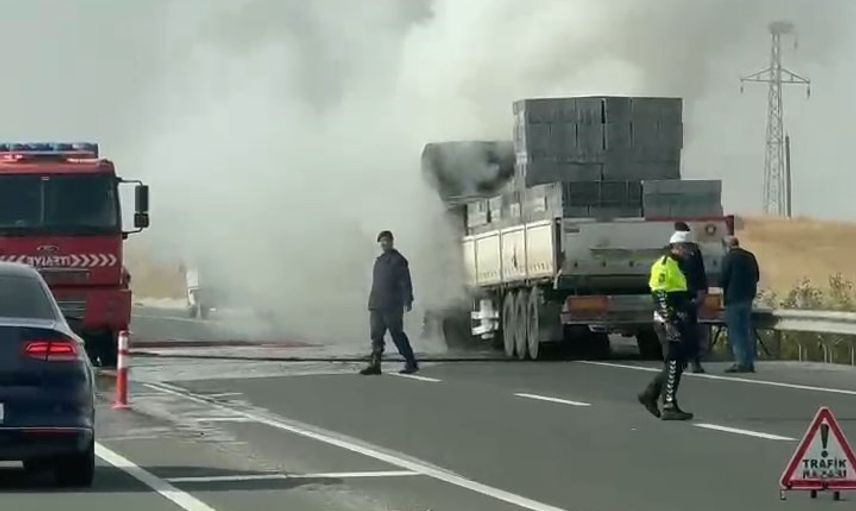 Edinilen bilgilere göre, tuğla yüklü tır, seyir halindeyken aniden alev aldı. Tırın sürücüsü durumu fark ederek aracı kenara çekti ve hemen tırdan indi.