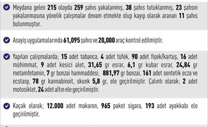 Elazığ Valiliği, bu dönemde yapılan denetimlerde 61,095 şahıs ve 20,000 araç kontrol edildi. Kontrol edilen araçlardan, 2,969264 araç trafikten men edildi.