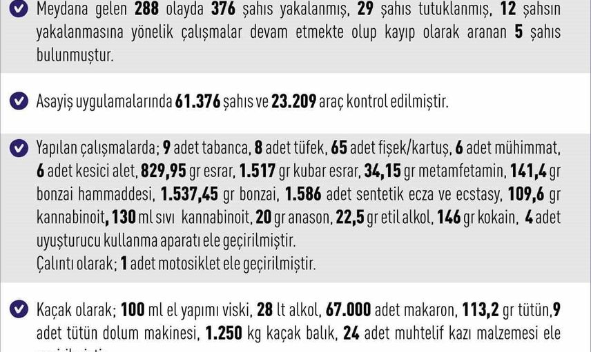Uygulamalar çerçevesinde 61.376 şahıs ve 23.209 araç detaylı bir şekilde denetlendi. Kontrol edilen araçlardan 2.783’üne cezai işlem uygulanırken 226 araç trafikten men edilmiştir.