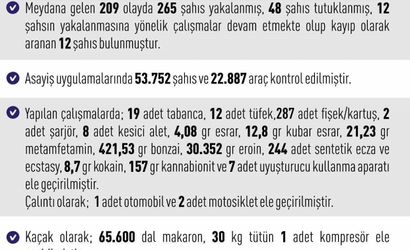 Bu olaylar sonucunda toplamda 265 şahıs yakalandı ve 48 kişi tutuklandı. Uygulama kapsamında 53 bin 752 kişi ve 22 bin 887 araç üzerinde denetim gerçekleştirildi.
