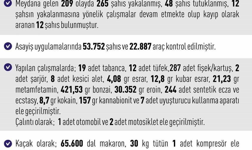 Yapılan denetimlerde; 19 tabanca, 12 tüfek, 287 fişek/kartuş, 2 şarjör, 8 kesici alet, 30 kilo 352 gram eroin, 421,53 gram bonzai ve 244 sentetik ecza gibi birçok uyuşturucu madde ele geçirildi. Ayrıca çalıntı olarak 1 otomobil, 2 motosiklet ile birlikte 65,600 dal makaron ve 30 kilo tütün de bulundu.