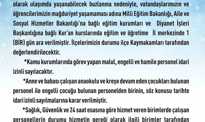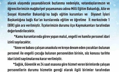 Açıklamada ayrıca, ilçelerdeki durumun ilçe Kaymakamları tarafından değerlendirileceği belirtiliyor. Kamu kurumlarında görevli olan malul, engelli ve hamile personelin de idari izinli sayılacağı duyuruldu.