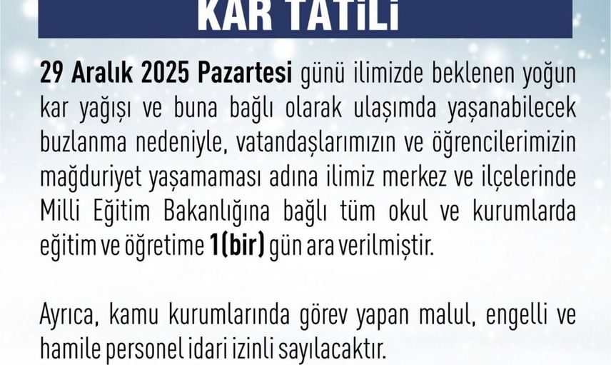 Valilikten yapılan duyuruda; "İlimiz merkez ve ilçelerinde Milli Eğitim Bakanlığı'na bağlı bütün okul ve kurumlarda eğitim-öğretime 1 gün süreyle ara verilmiştir. Ayrıca, kamu kurumlarında çalışan malul, engelli ve hamile personel için de idari izin uygulaması getirilecektir." ifadeleri yer aldı. Önemli Not: